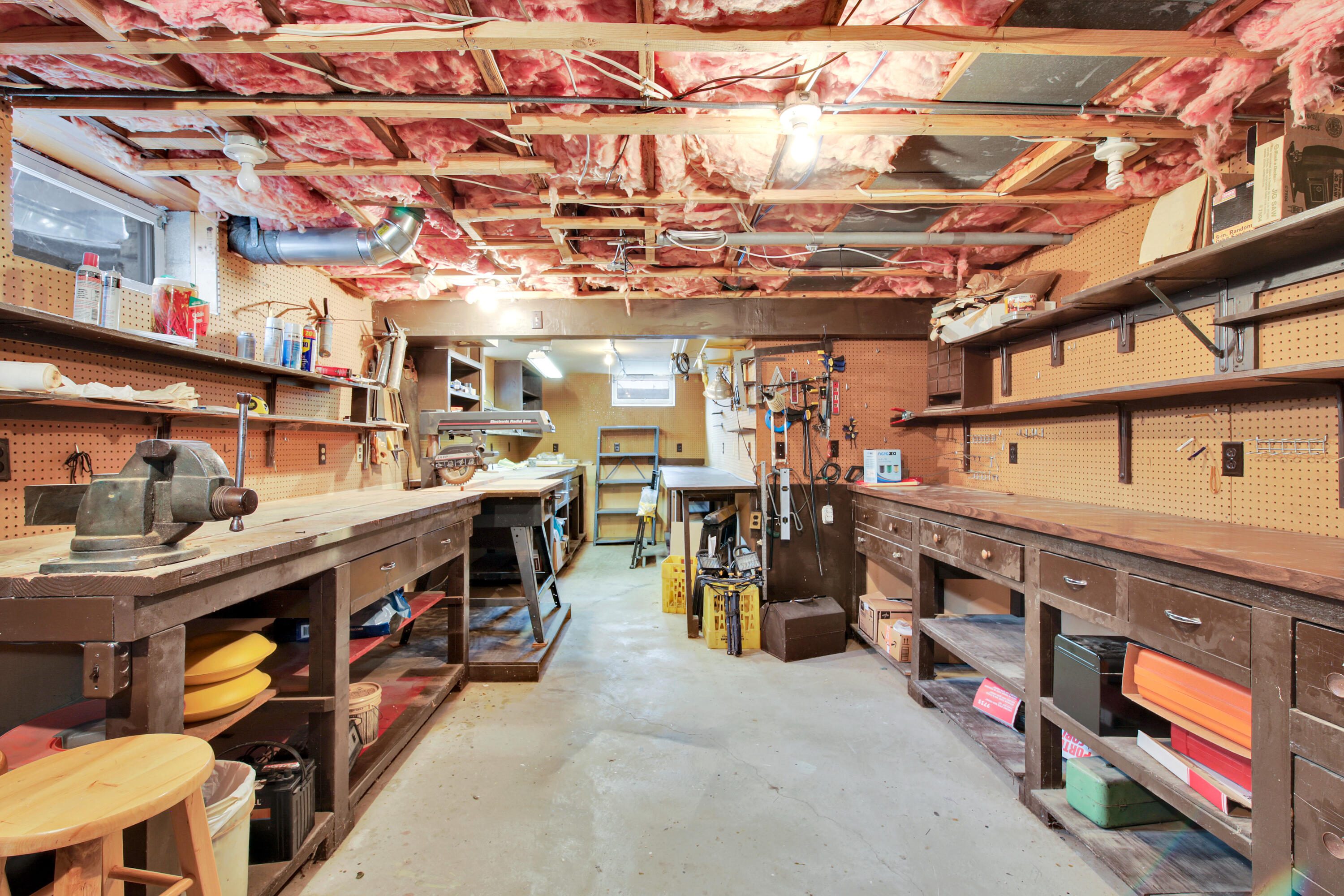 Stately lannon stone ranch home is both impressive and comfortable! Large foyer welcomes you in to the living room with gas fireplace with a raised hearth; spacious dining room easily accommodates festive dinners; lots of counter space in the kitchen and a big pantry with a mini fridge for extra beverages; pleasant dinette space overlooks backyard. HUGE master bedroom suite features an updated bath with quartz vanity top and walk-in shower; 2 more bedrooms, another full bath and a main floor laundry room round out the first floor. Downstairs you will find a rec room with adjacent bar/kitchen space, 3rd full bath, LOADS of storage space and shelving AND a giant work room with workbenches -- vice, table saw and grinder included!! Big garage has an antenna for local TV enjoyment. WOW!!